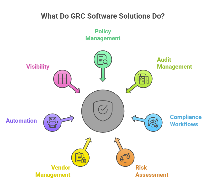 GRC tools help organizations identify, assess, and mitigate risks while ensuring adherence to regulatory requirements and internal policies. They streamline processes like audits, reporting, and compliance tracking, often using automation to reduce manual work and provide real-time visibility into risk exposure and governance performance.