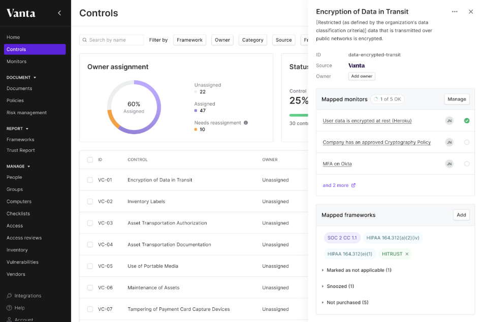 Vanta is one of the most established names in compliance automation. Its core values are automating evidence collection, continuously monitoring controls, and providing teams with a centralized view of policies, issues, risks, and vendor records. It is especially strong for fast-moving companies that want to compress audit prep and reduce manual compliance work. The tradeoff is that its risk capabilities are still mostly oriented around program management rather than deep exposure analysis.