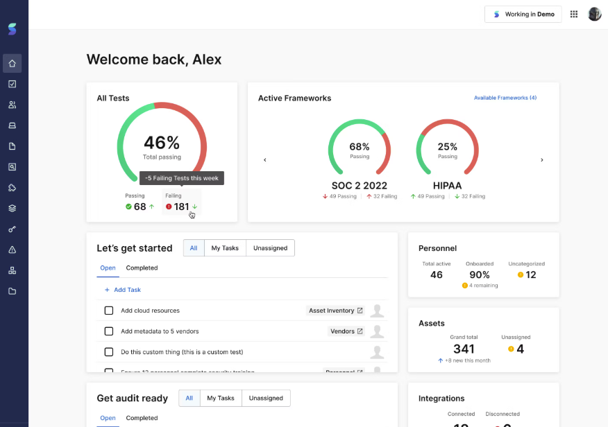 Secureframe is a compliance automation platform that helps teams achieve and maintain frameworks such as SOC 2, ISO 27001, and HIPAA with less manual effort. It automates evidence collection by integrating with cloud infrastructure (e.g., AWS, Okta, GitHub), continuously tests controls against framework requirements, and surfaces gaps with guided remediation steps tied to specific compliance controls.