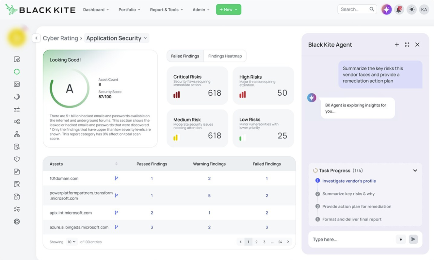 Black Kite goes beyond basic security ratings by layering in threat modeling and financial risk context. It analyzes external signals like vulnerabilities, misconfigurations, breach history, and ransomware exposure, then maps those findings to frameworks such as MITRE ATT&CK and translates them into potential business impact. The result is a more contextual view of how vendor weaknesses can affect your broader perimeter security. That said, it still operates from an outside-in perspective. Insights are based on observable data and modeled scenarios.